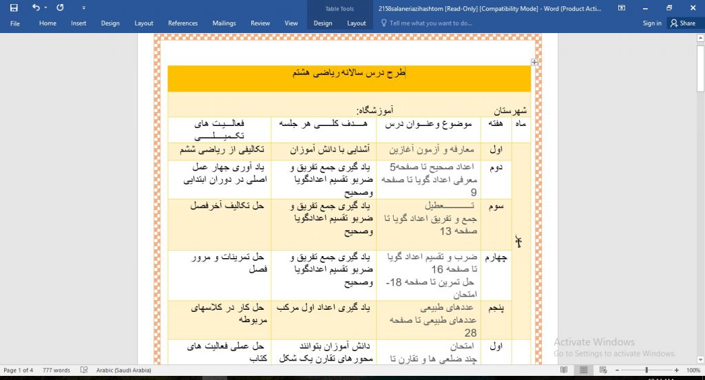 طرح درس سالانه ریاضی هشتم
