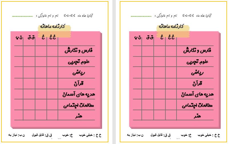 - طراحیشده با جدیدترین الگوی کارنامه ماهانه رسمی آموزشوپرورش