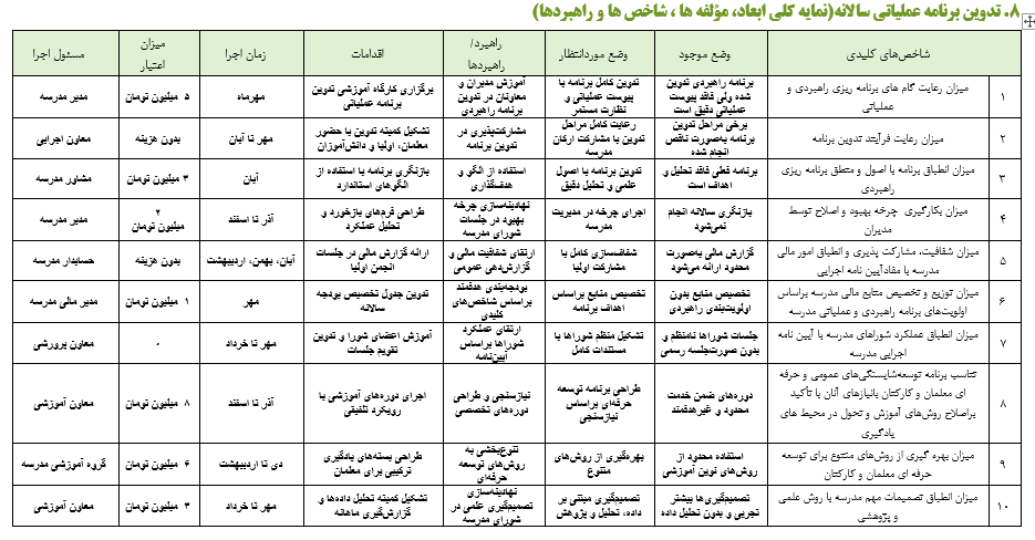 8. تدوین برنامه عملیاتی سالانه (نمایه کلی ابعاد، مؤلفه ها، شاخص ها و راهبردها)