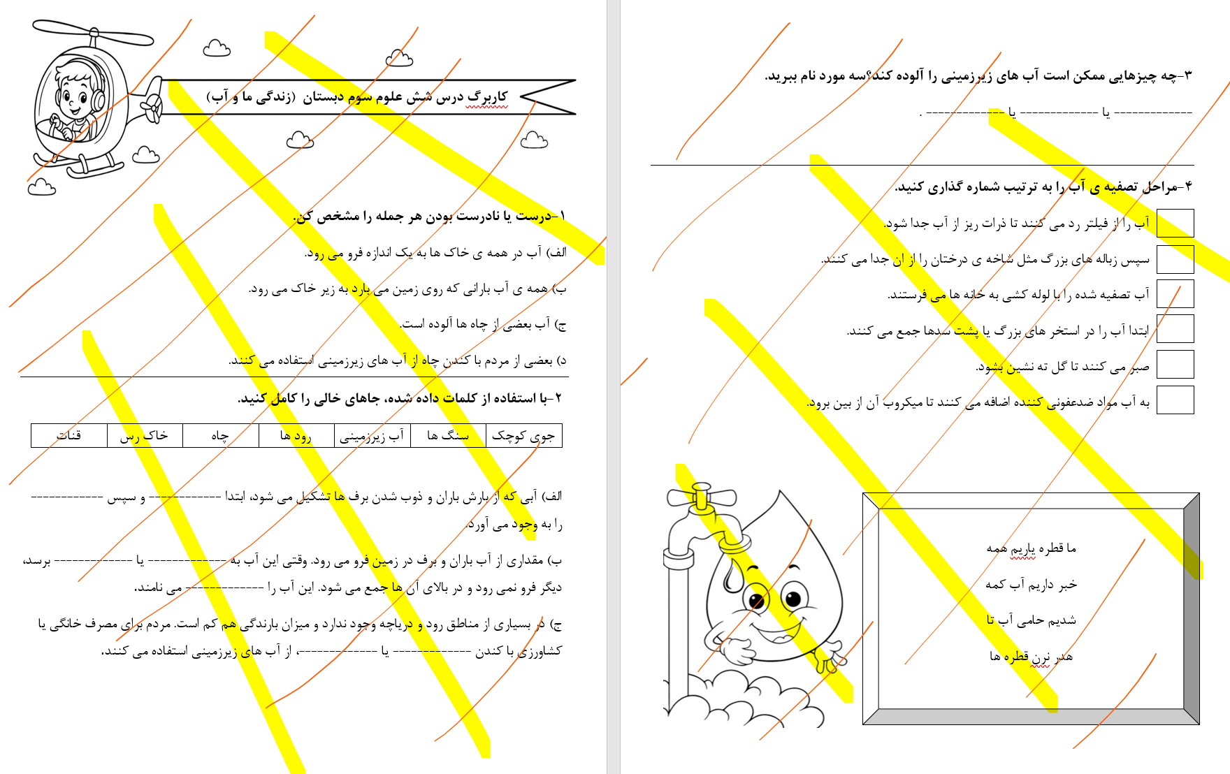- بیشتر -کاربرگ درس 6 علوم سوم دبستان، زندگی ما و آب، شامل نمونه سوال و رنگ امیزی