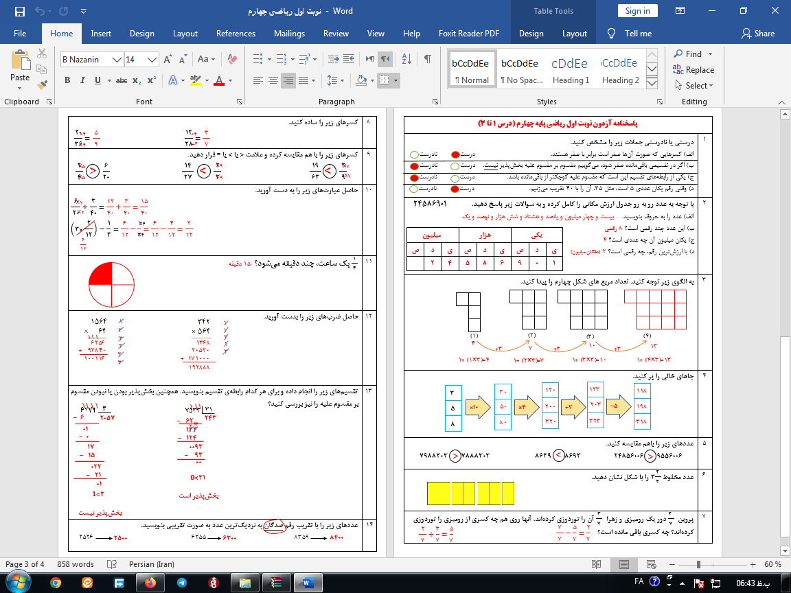 • نمونه سوالات نوبت اول ریاضی چهارم ابتدایی