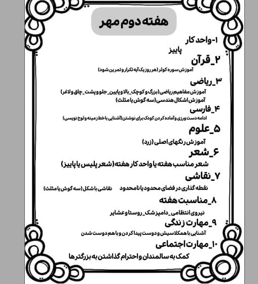 - بیشتر -دانلود برنامه کاری هفتگی پیش دبستانی هفته دوم مهر ماه