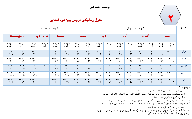 جدول زمانبندی تدریس دروس پایهی دوم ابتدایی برای سال تحصیلی 1405-1404 به همراه جدول تعطیلات رسمی مدارس ایران | مطابق با آخرین تغییرات کتاب های درسی