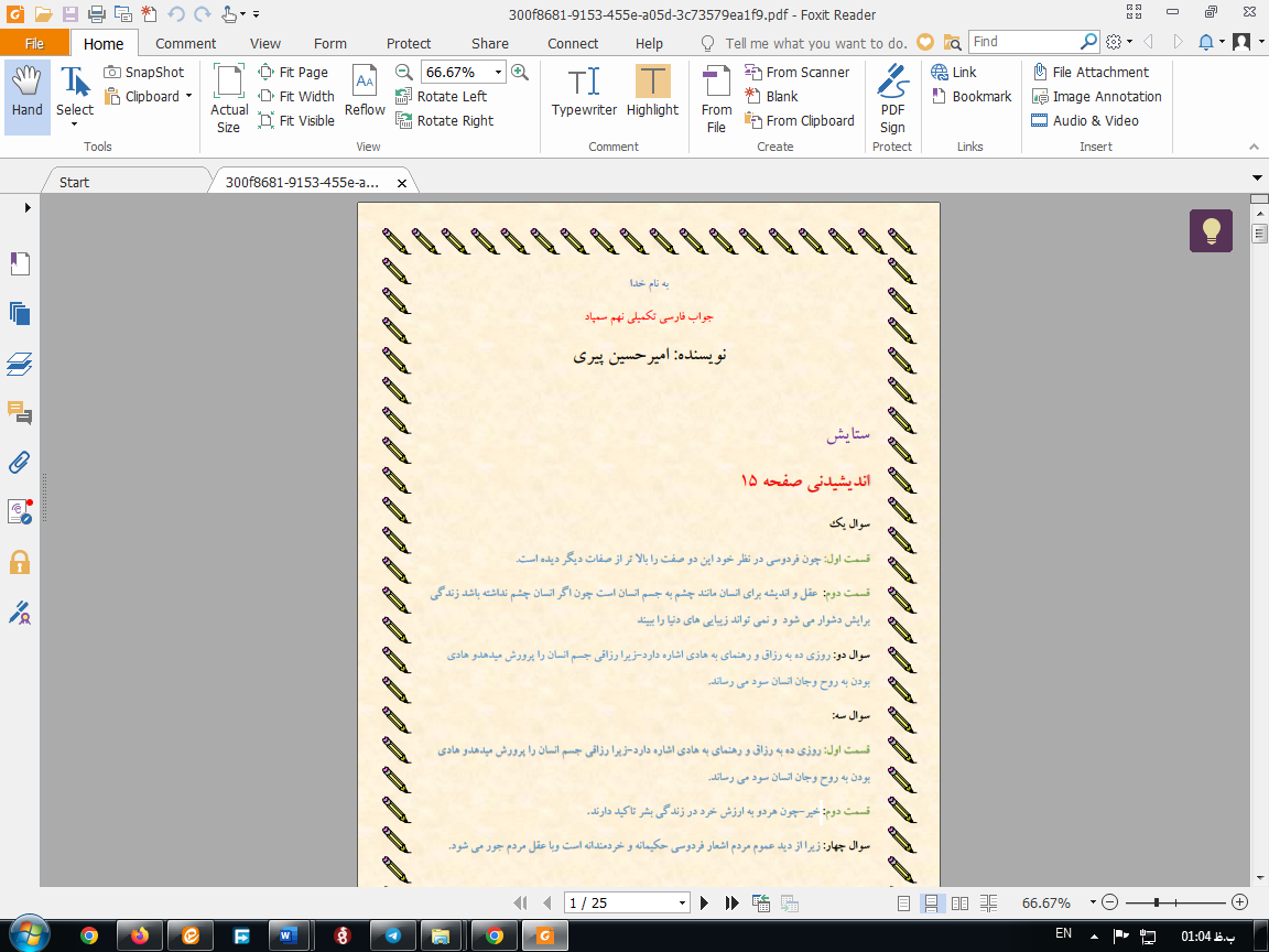 پاسخنامه تکمیلی فارسی هفتم مدارس سمپاد کل دروس فرمت فایل PDF با کیفیت عالی جهت پرینتی